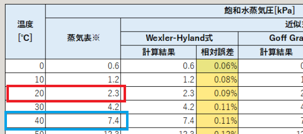 蒸気表によると、例えば20℃の空気の飽和水蒸気圧は約2.3kPa、40℃の空気の飽和水蒸気圧は約7.4kPaです(図1)。