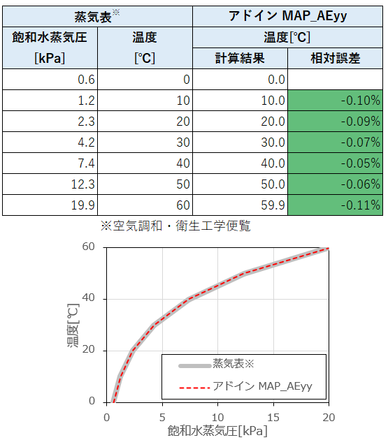 図3 飽和水蒸気圧→温度の計算結果と誤差