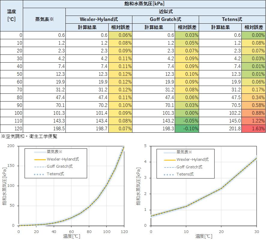建築の環境領域であるの0~40℃を見ると、Goff Gratch式の誤差が相対的に小さい結果です。