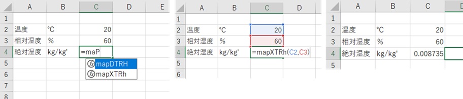 同じような方法で、以下の関数が使えるようになり「湿り空気の状態値」が計算できます。