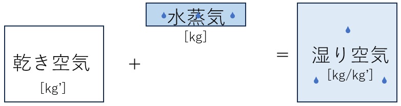 - 絶対湿度[kg/kg’]:乾き空気1kgあたりの水蒸気の質量[kg]