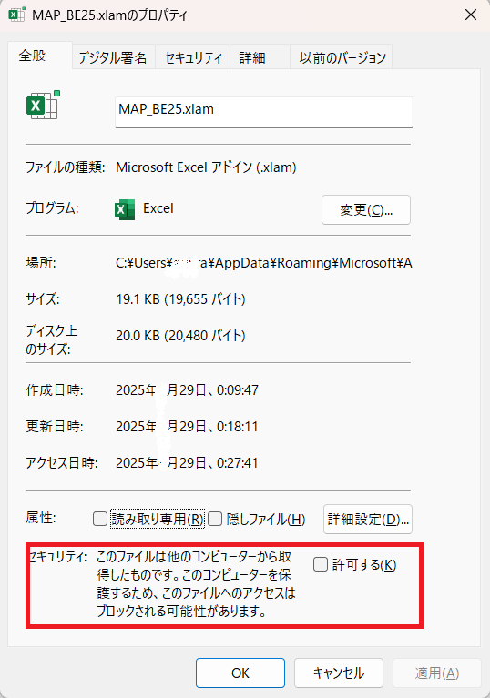 - 図2:Windowsのエクスプローラで“MAP_BE25.xlam”、“MAP_AE25.xlam”を右クリック-「プロパティ」ー「セキュリティ」ー「許可する」で、ファイルのブロックを解除する。