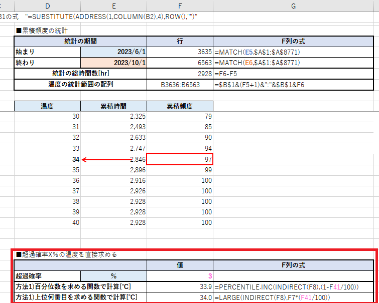 超過確率3%の時の外気温は、前者は33.9℃、後者は34.0℃で選ばれたデータが1つ分異なりましたが、上で一覧表で求めた結果と合っているのが分かります。