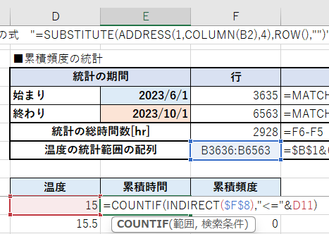 下左図では、E列の式を”=COUNTIF(INDIRECT($F$8),”<=”&D11)”とし、6/1の0:00から10/1の0:00の毎時外気温であるセル範囲”B3636:B6563”について、D列(セルD11)の温度15℃より低い時間数を計算しています。