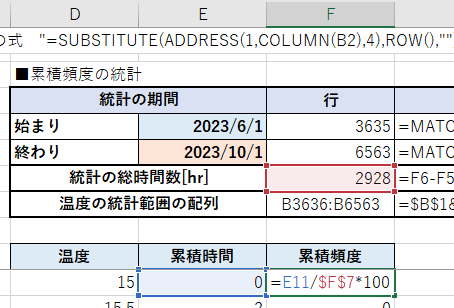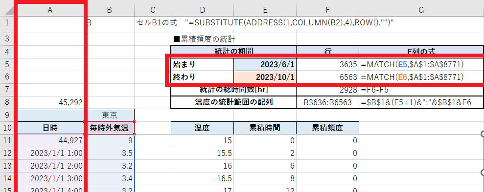 ・セルF5では、A列の毎時の時刻データから、2023/6/1 0:00の行番号(3635行)を計算しています。同じくセルF6では、2023/10/1 0:00のA列の行番号(6563行)を計算しています。