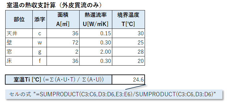 建物内の温度が外皮の貫流熱だけで決まるときのこの温度を、エクセルで簡単に計算する方法を記します。
